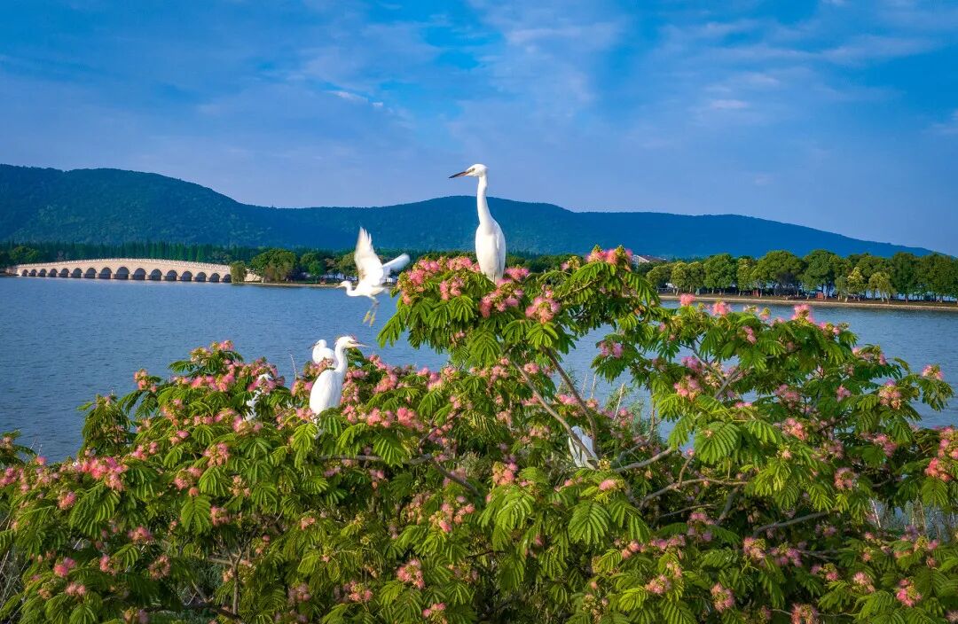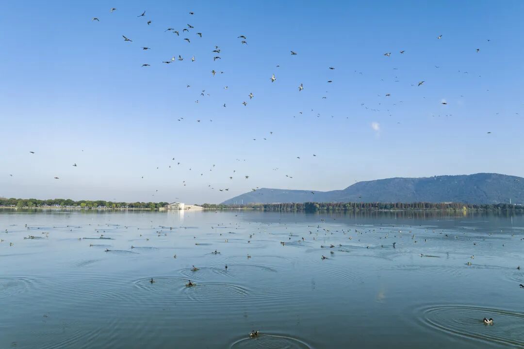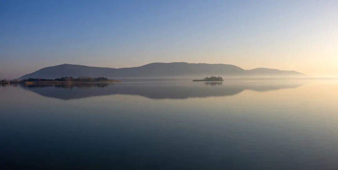 大块岂无意,赠我一湖烟。黄公山水屏中,浓淡濯尘喧。十里春峰描黛,万顷春波涵碧,相对两悠然。偶有白鸥过,界破水中天。