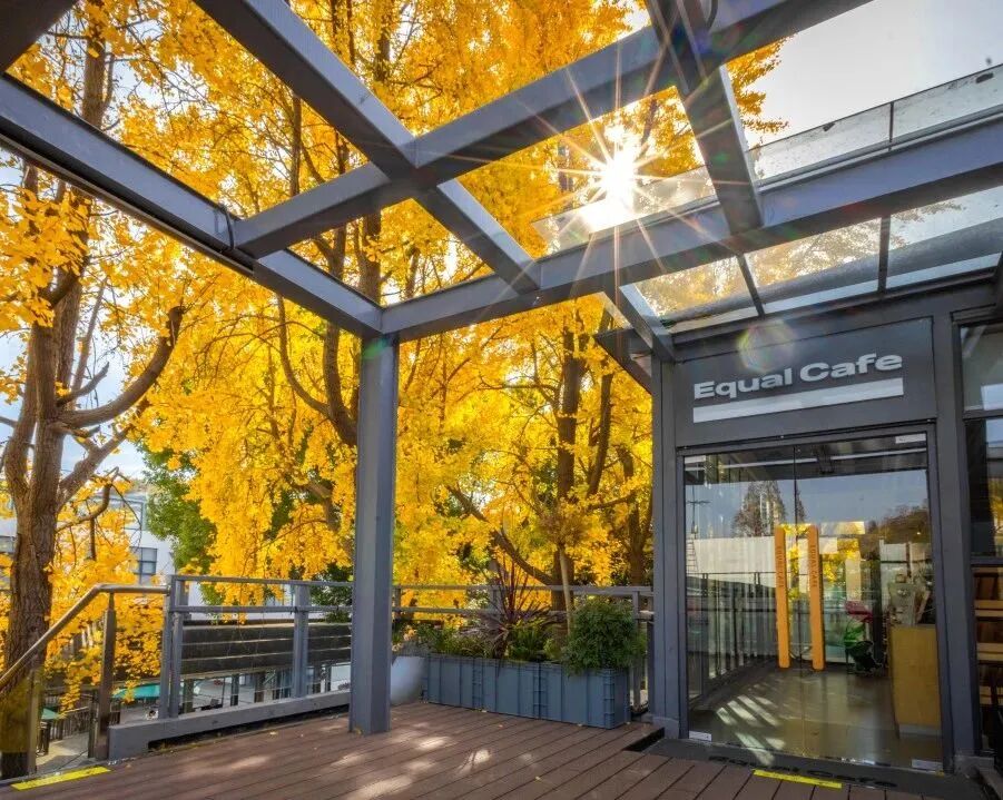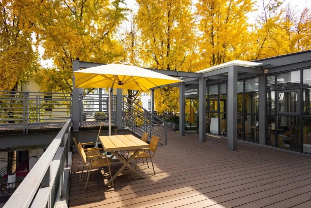 值此时节,图书馆里茂盛的银杏树已经悄悄黄了叶,层层叠叠铺满了地面,还有一处天然的“银杏阅览区”。阳光沿着枝叶的缝隙溜进来,圈出了一方静谧的空间。