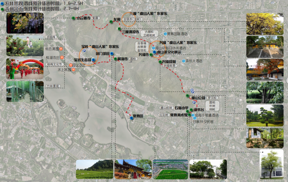 串联虞山红豆树、罗汉松、古香樟、六朝松、古银杏等古树名木和农林景观,策划8.1公里的名木风采鉴赏线及4.8公里的乡野悠游体验线。
