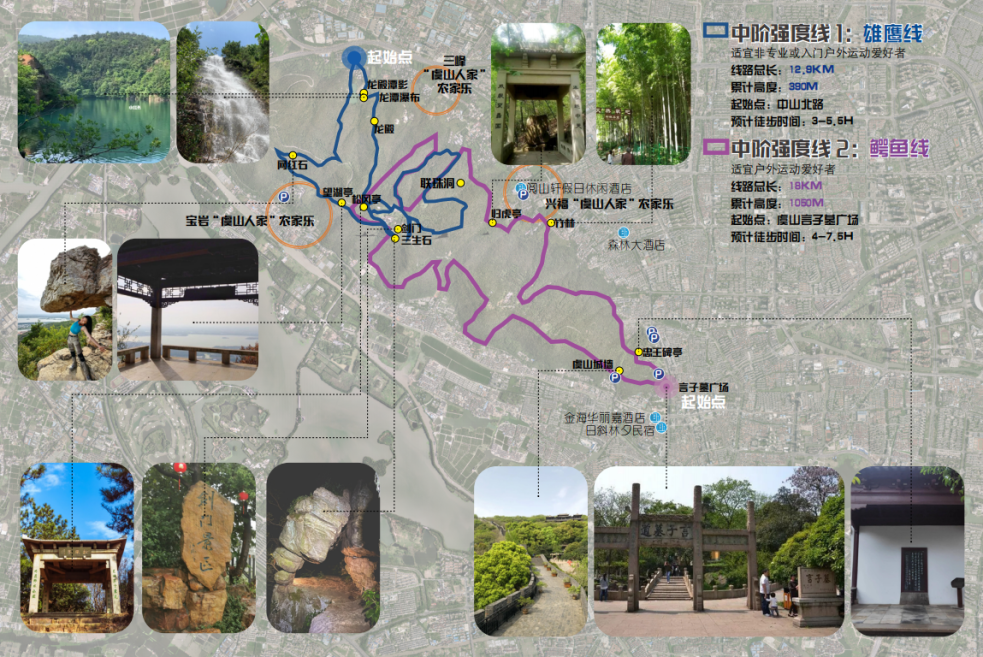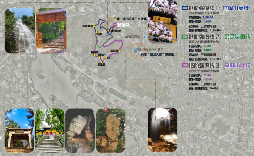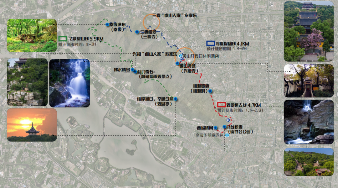 串联书台积雪、西城楼阁、维摩旭日、秦坡瀑布等虞山十八景打卡点位,策划5.9公里的飞泉望山线、4.7公里的观景怀古线以及4.1公里的寻境探幽线三条主题徒步线路。