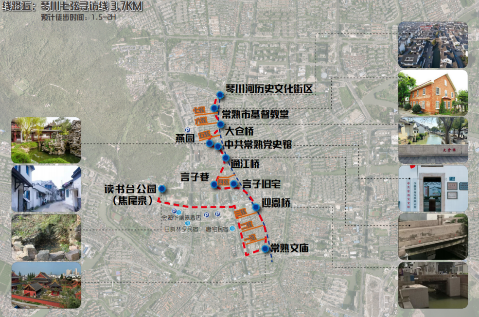 以书台公园焦尾泉为起点,沿琴川河历史文化街区,依次寻访古琴川河七弦遗存,线路长度3.7公里。