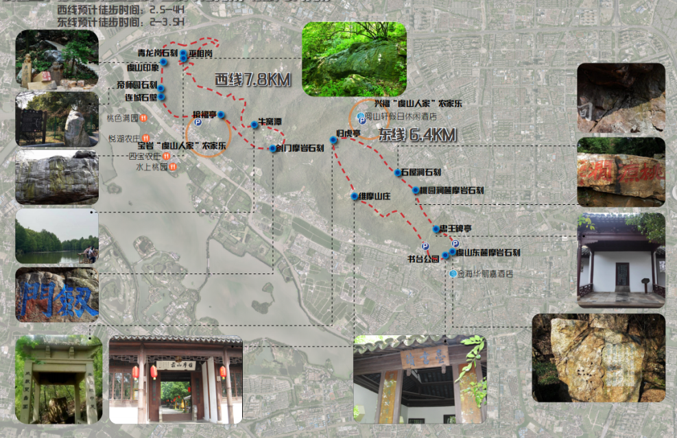 串联起镌刻在虞山和周边景点的书台公园、虞山东麓、剑门、帝师园等15处虞山摩崖石刻,策划西线7.8公里及东线6.4公里两条徒步线路。