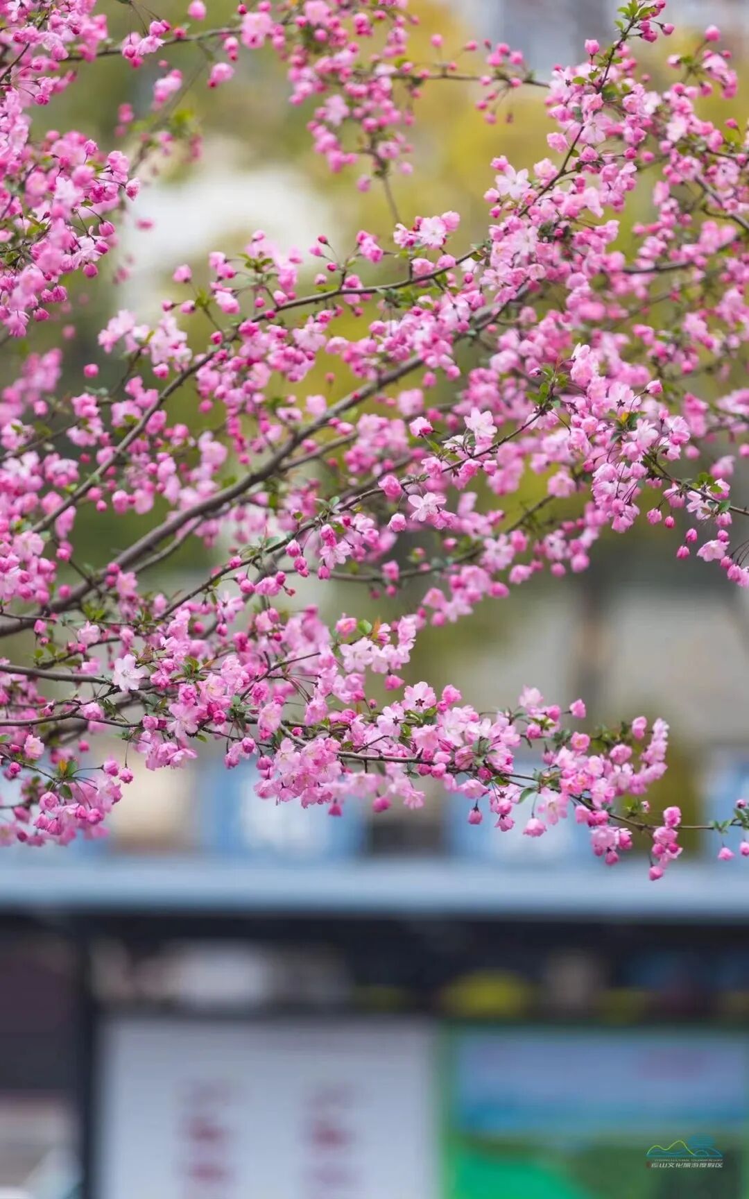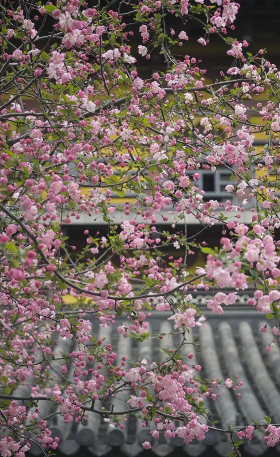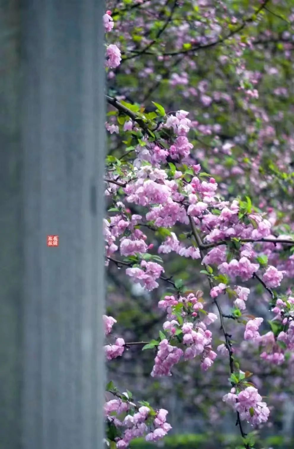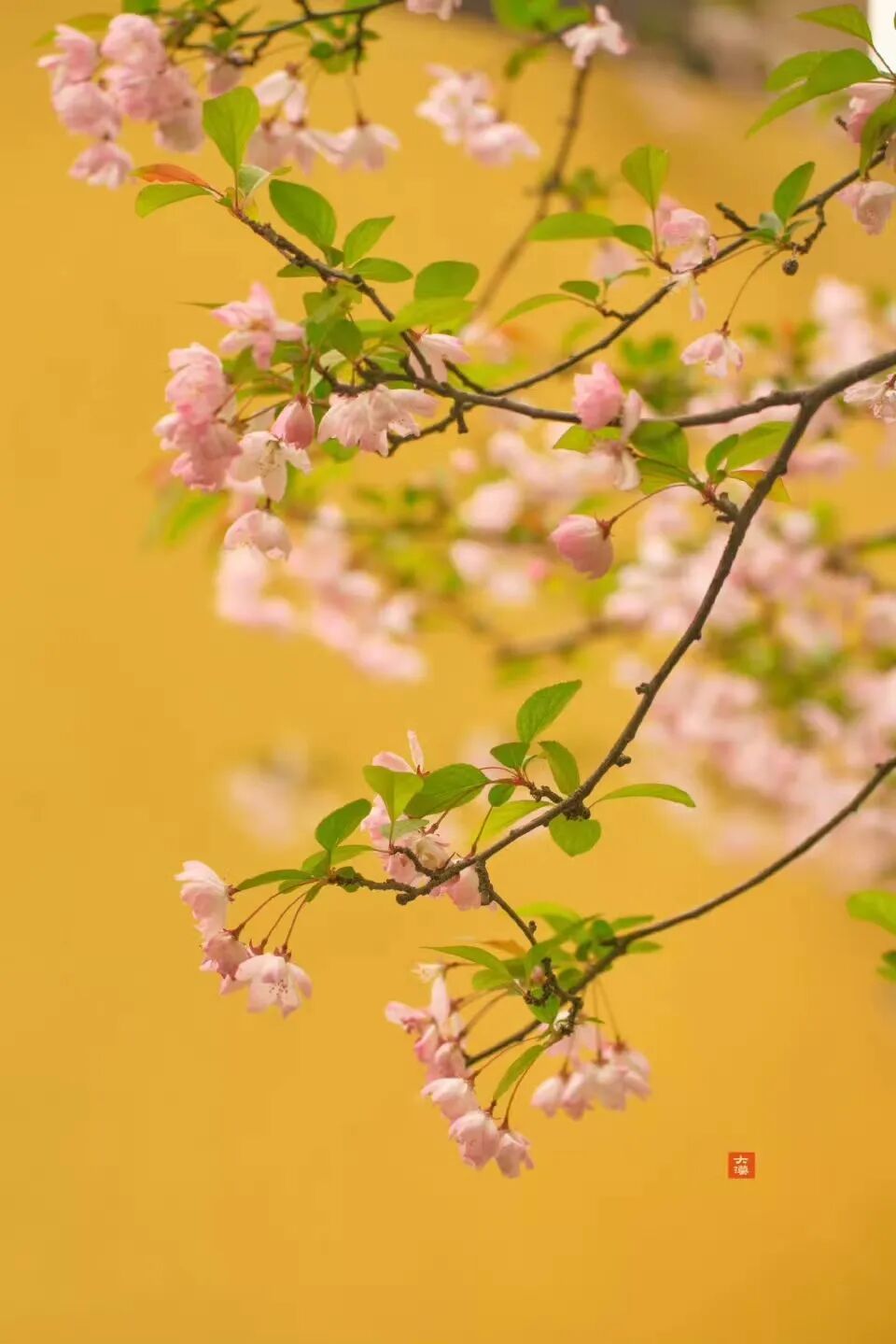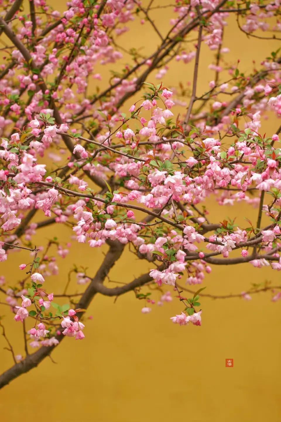 掩映着明黄的院墙,细密的花瓣如同胭脂点点晕染其中,别有一番国画写意之美。