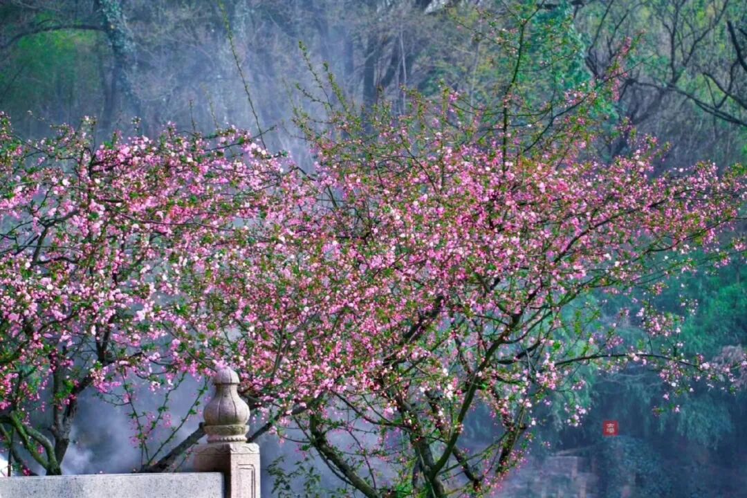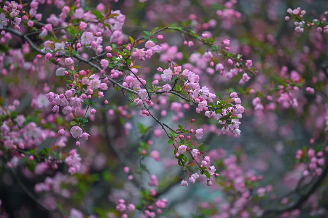 层层叠叠的小花占满了枝头,高低错落。花的色彩既不会太过浓艳,又不至于寡淡,是调和得恰到好处的粉白。有的含苞,有的盛放,不同形态的花朵在绿叶的陪衬下显得热闹极了。