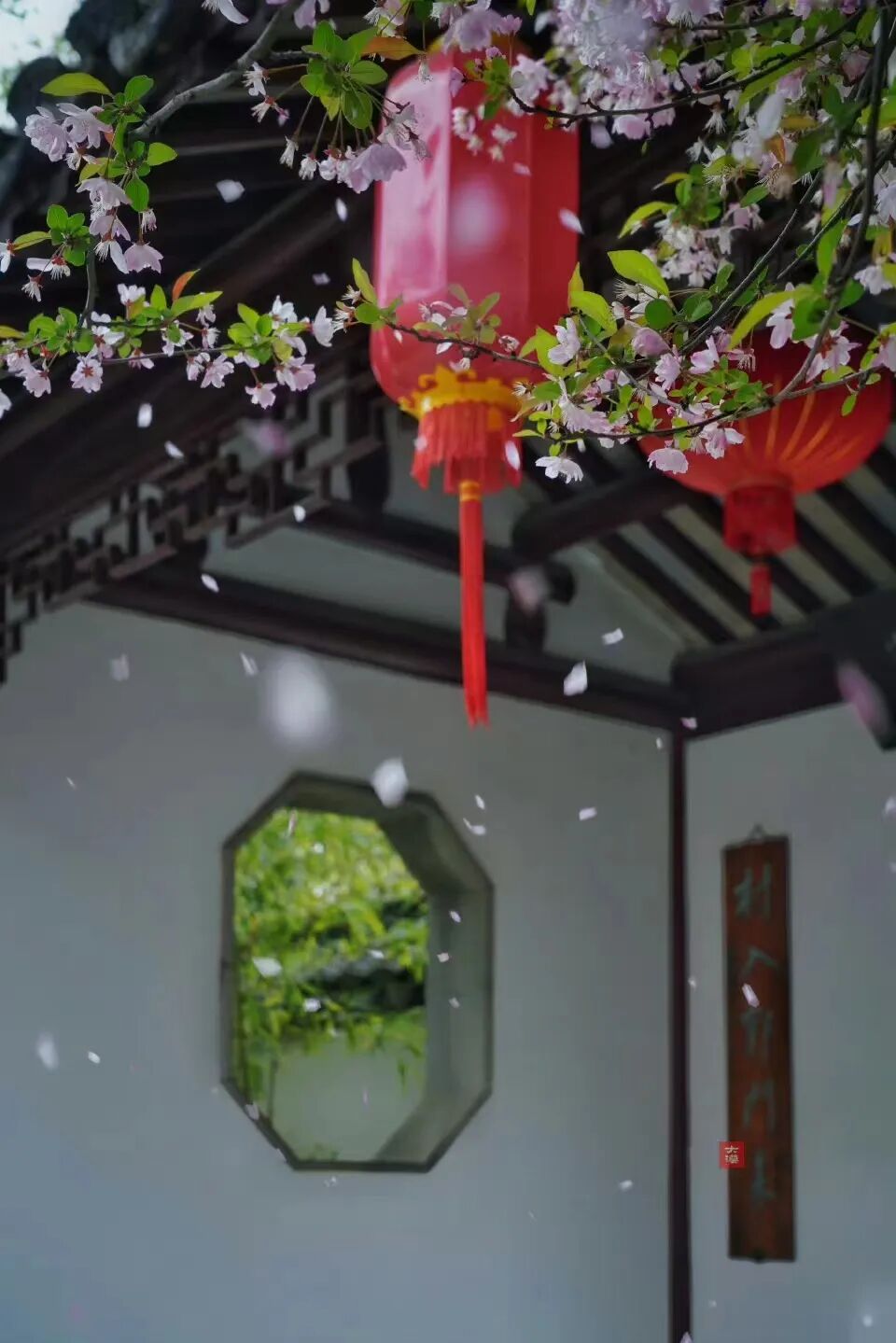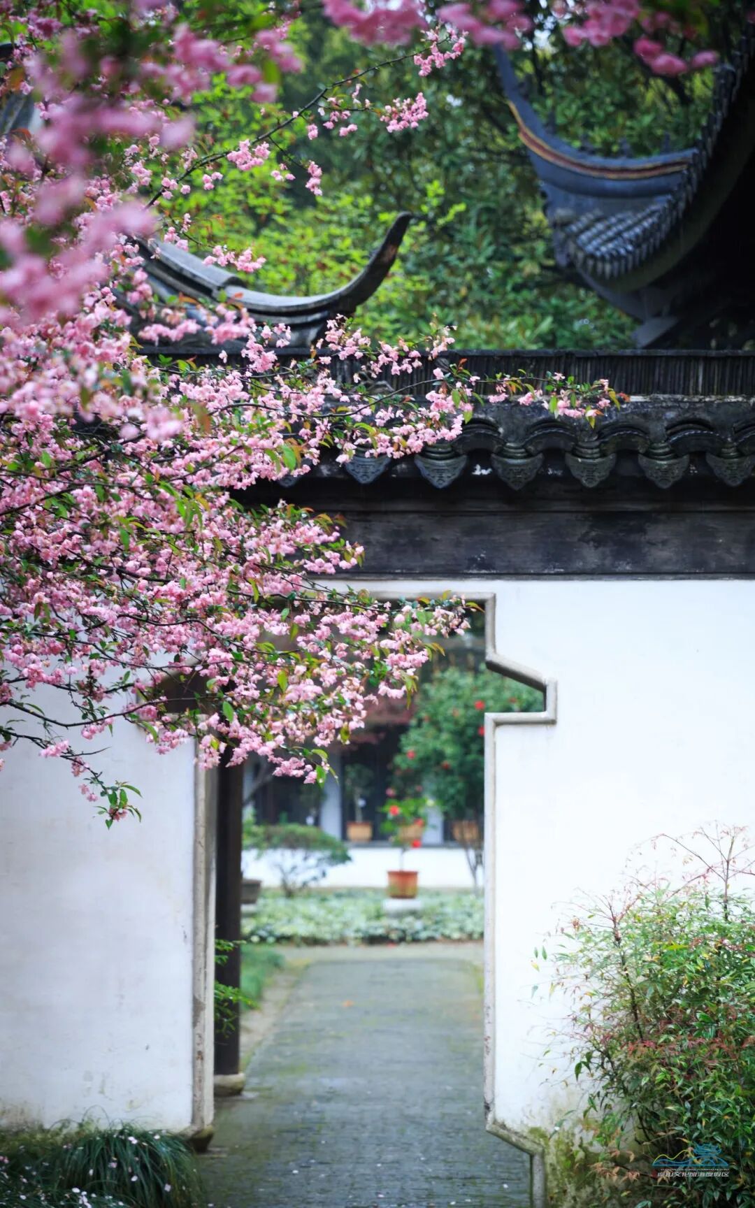 幽曲的长廊外,灵动的飞檐上,海棠花开袅娜,轻轻摇曳,为这座典雅的江南园林又增添了几分韵味。