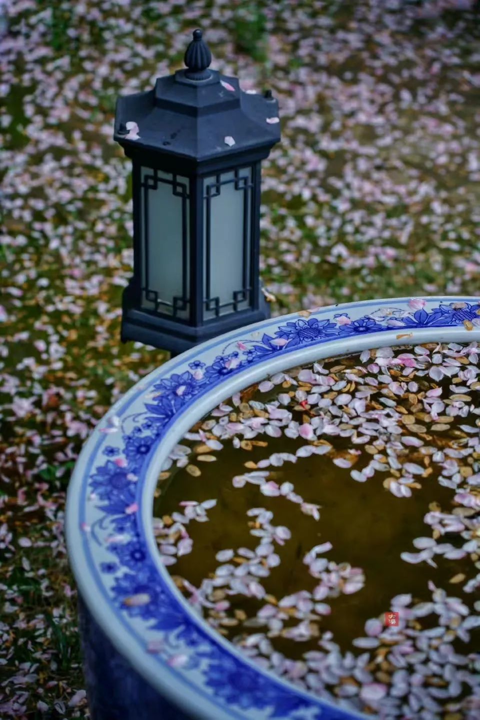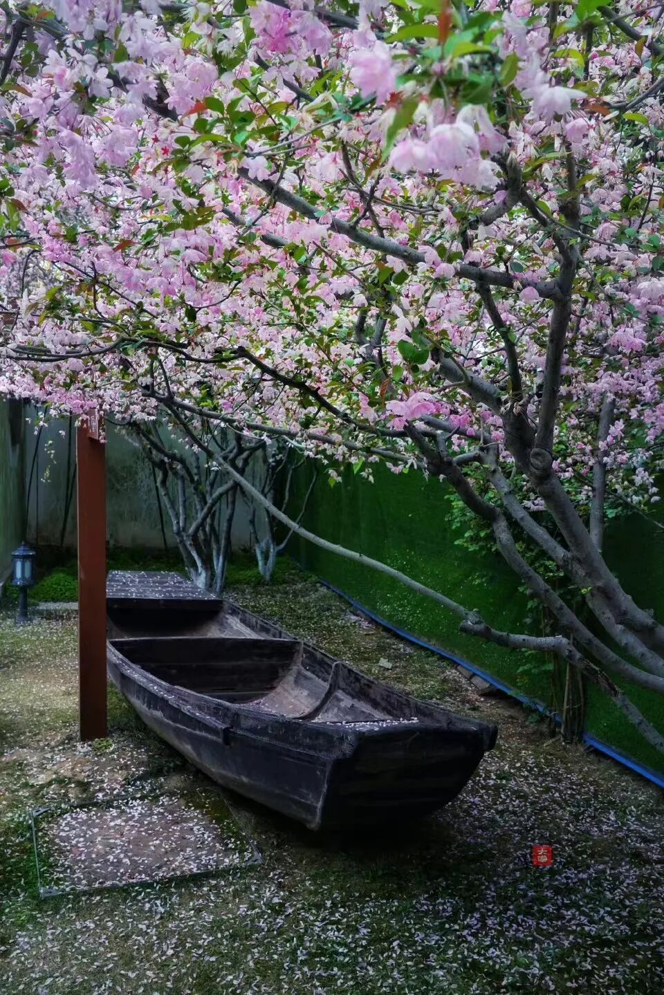 偶尔一阵风过,吹得海棠片片飘飞,肆意而落。地上、水面,不问去处,自由洒脱。哪里有海棠,哪里就有春光。