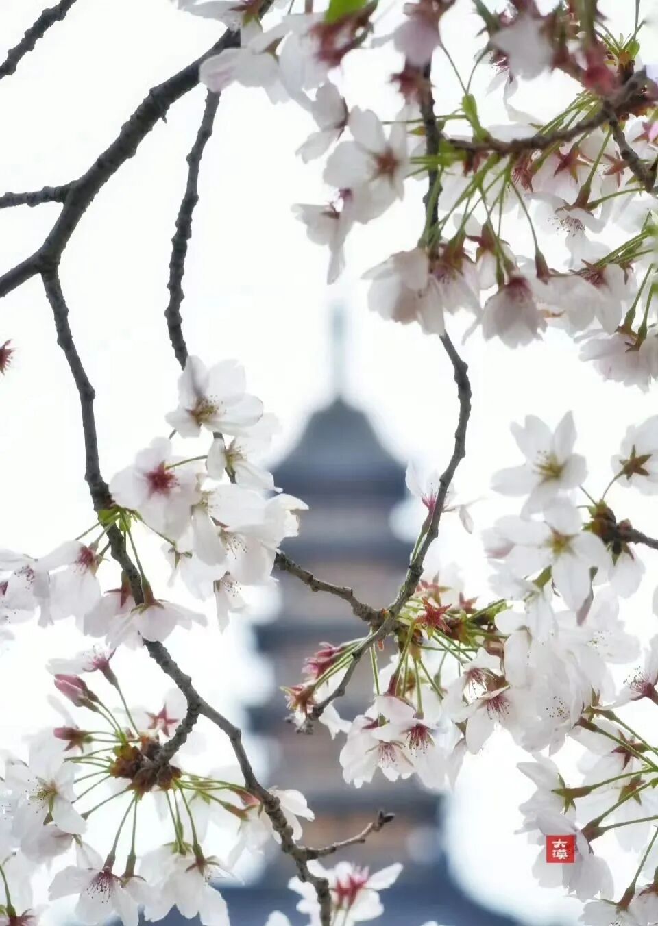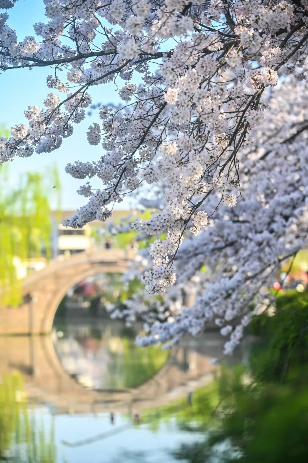 拍大场景的时候,可以借点周围的环境,像是石桥、古塔、柳树,都和樱花很搭。拍出来画面丰富,既能感受花开连片的壮观,也很有意境。