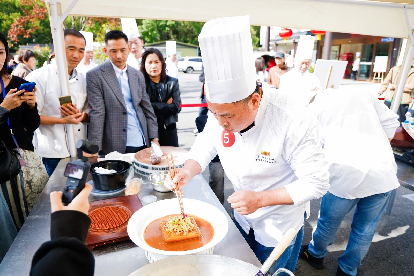 美食挑战赛现场,参赛大厨们各展绝技,围绕“常熟必吃菜”“虞山招牌菜”“当季养生菜”“创意融合菜”“虞山特色菜”五大类菜品展开角逐。他们深耕本地食材,将虞山的松树蕈、桂花板栗、尚湖大白丝、鲜桂鱼等时令物产融入创作,在传承常熟蒸菜、叫花鸡等传统烹饪技艺的同时大胆创新,让每一道菜品都成为山水灵感与人间烟火的深情对白。