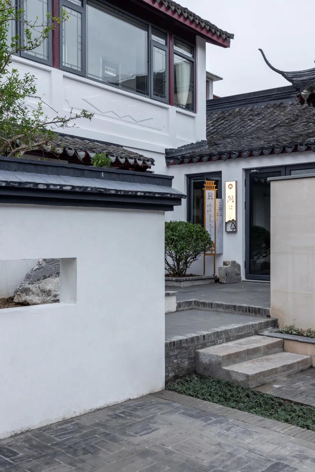 民宿的外面,各色亭台绕墙而过,青翠的树叶拥抱其中,花开散香。步入民宿,具有典型江南流派建筑,白墙青瓦映入眼帘,厅堂给人复古的既视感,从木舍卧榻,再到颇具禅意的茶室,卧房,是一处休生养息的绝佳处。