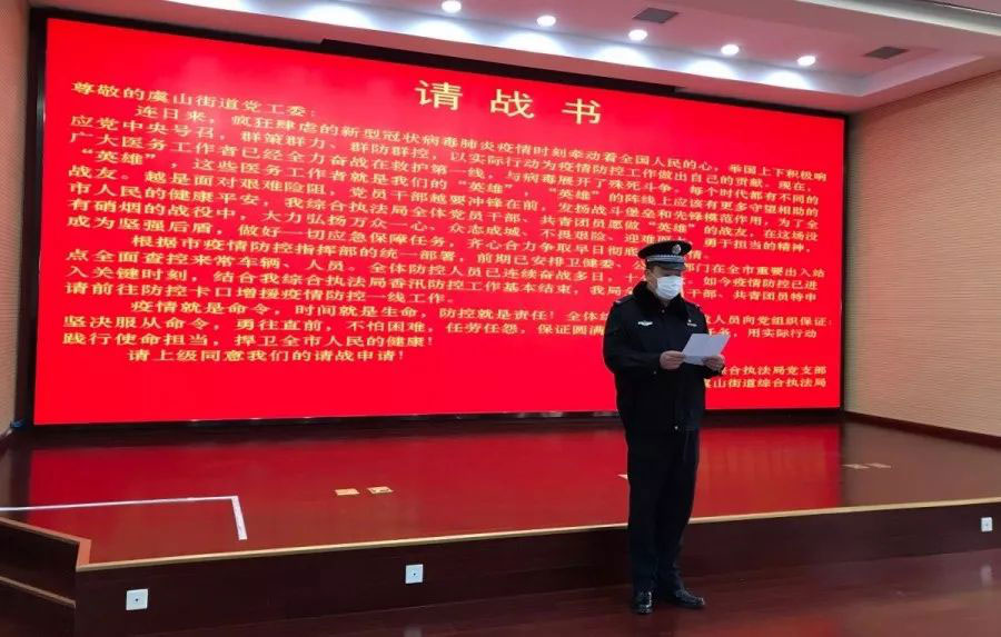 根据市疫情防控指挥部的统一部署,前期已安排卫健委、公安等部门在全市重要出入站点全面查控来常车辆、人员。全体防控人员已连续奋战多日,十分疲惫。如今疫情防控已进入关键时刻,结合我综合执法局香汛防控工作基本结束,我局全体党员干部、共青团员特申请前往防控卡口增援疫情防控一线工作。