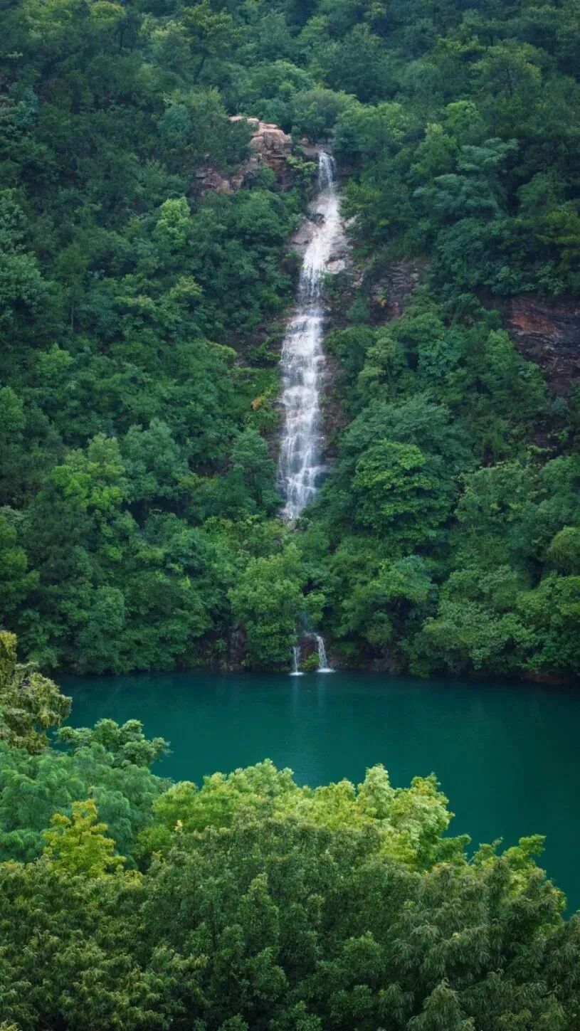 “千古长如白练飞,一条界破青山色”,梅雨季的到来,使得雨水在山上积聚。盈满之际,凝成一条银链,上衔青山,下接绿潭。瀑布一路高歌曼舞,带动游人的心绪一起奔涌。