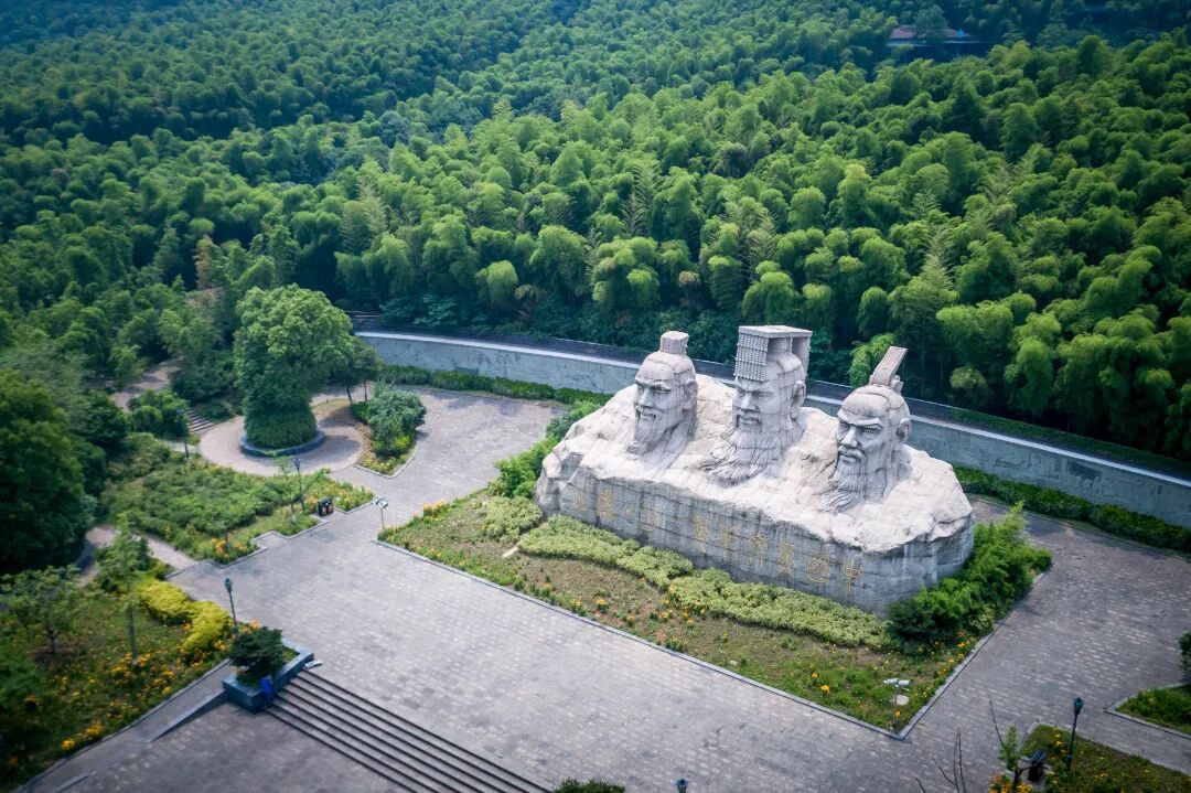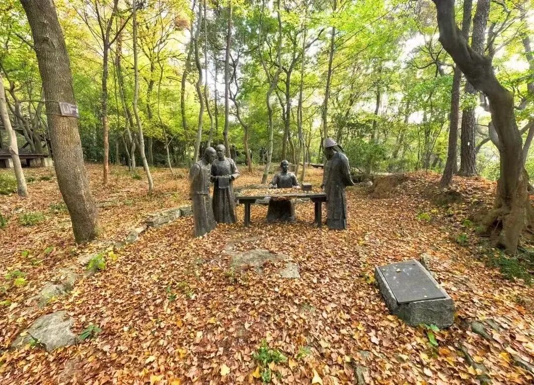 顺着山道慢慢前行,帝师园就位于眼前这片原始枫香林中。帝师园是为纪念清末两代帝师翁同龢而建,园中有“状元及第”“为帝授课”“平反冤案”“戊戌变法”等八组雕塑群体,记录翁同龢的生平事迹。配合碑刻等形式,展示翁同龢的书法艺术作品。
