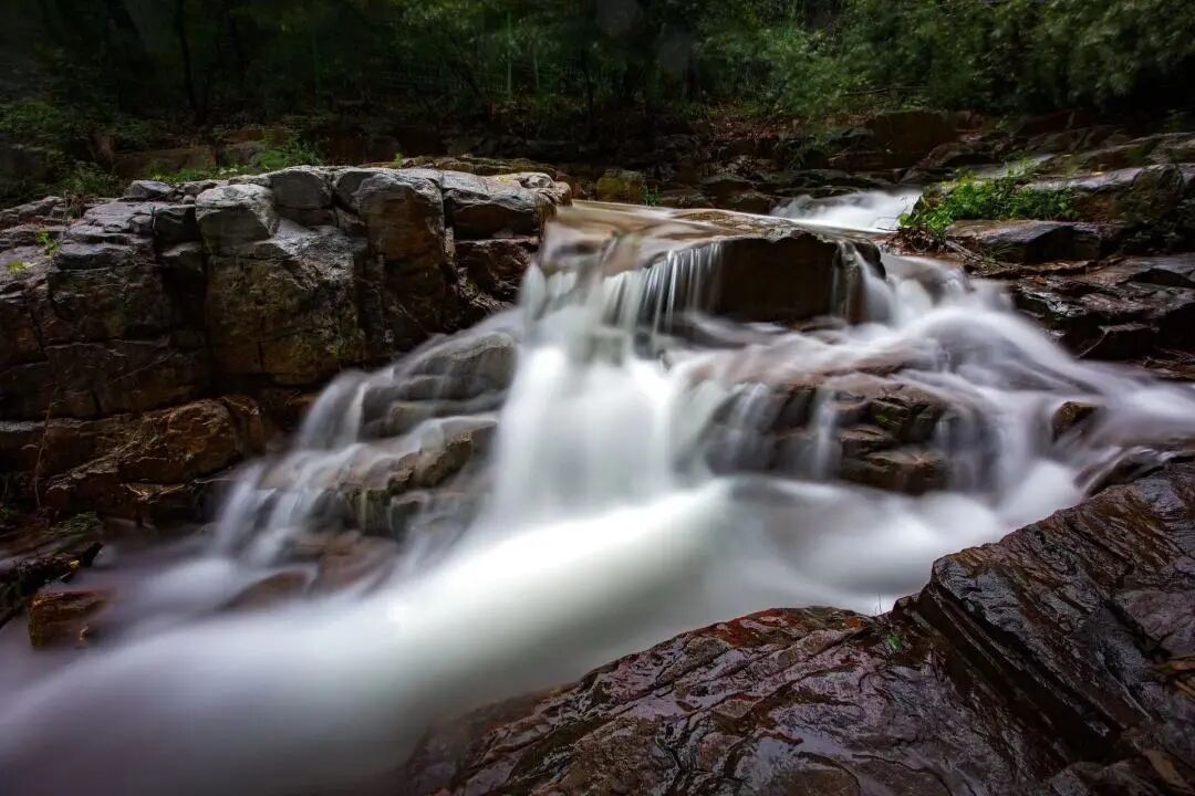 石屋涧长80余米,也是雨后观瀑的好去处。水珠不停赶路,编织成透明的屏风。岸石微微露出,也想一睹这亮丽的美景。