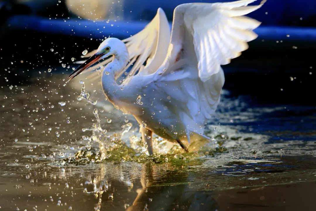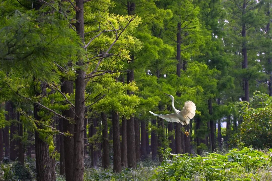 杉林之间,时常可以看见白鹭或是其他鸟类。它们踩水踏浪、追逐打闹,如同一个个精灵,俏皮可爱。
