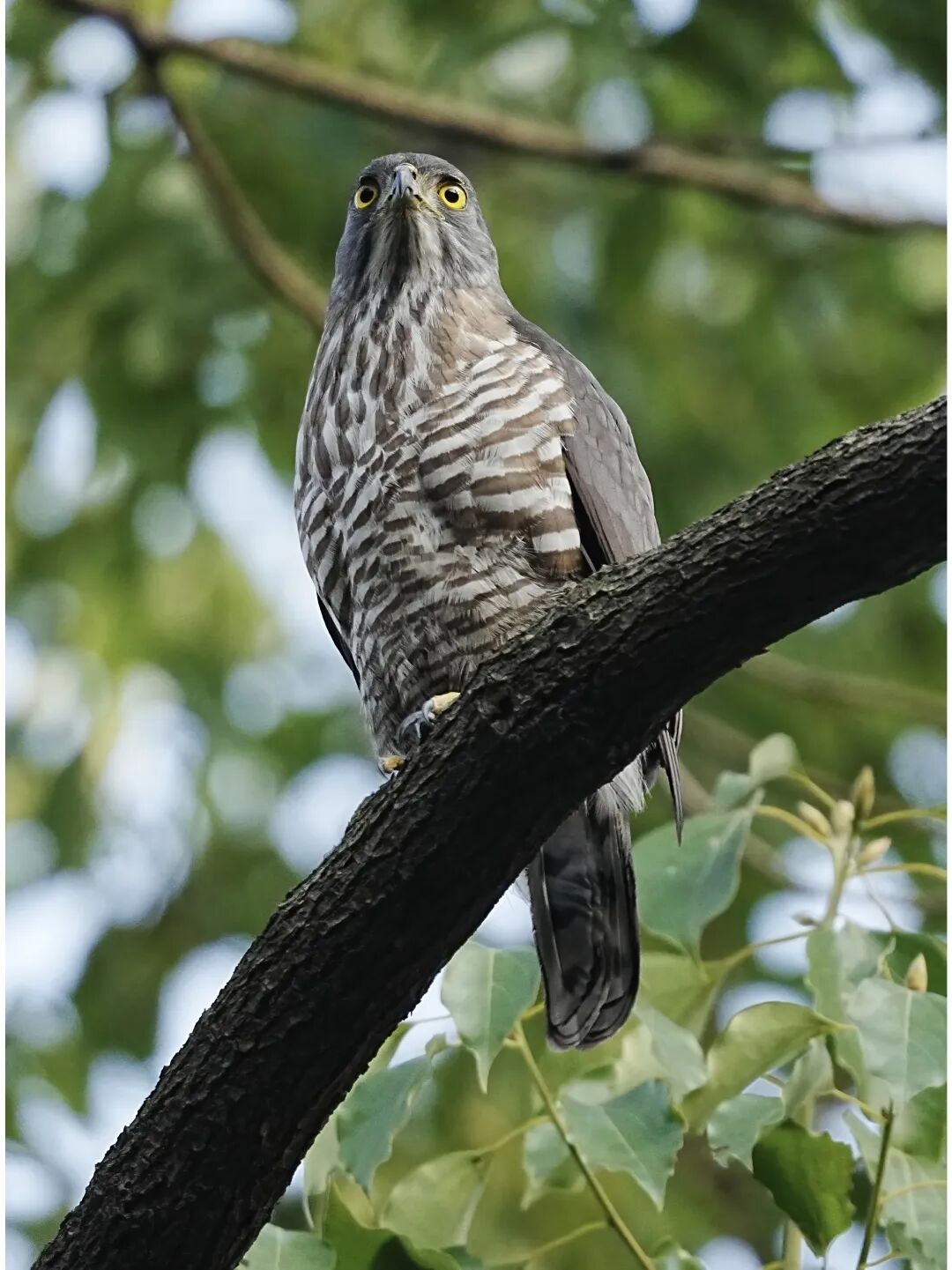 凤头鹰,鹰属鹰科,属于中等猛禽,为留鸟类,是国家二级重点保护动物,因头部有羽冠而得名。成年雄鸟上体灰褐,两翼及尾具横斑,下体为棕色,胸部有白色纵纹,腹部及大腿白色具近黑色粗横斑。凤头鹰多见于云南、四川等地,江苏少有。