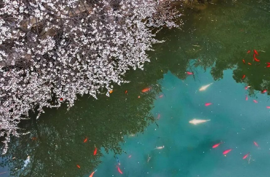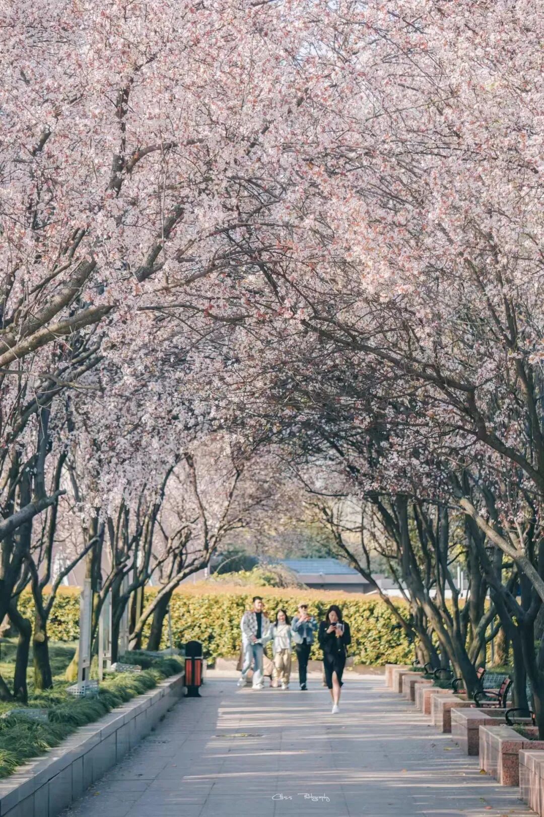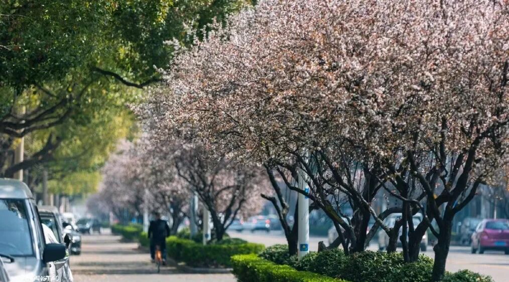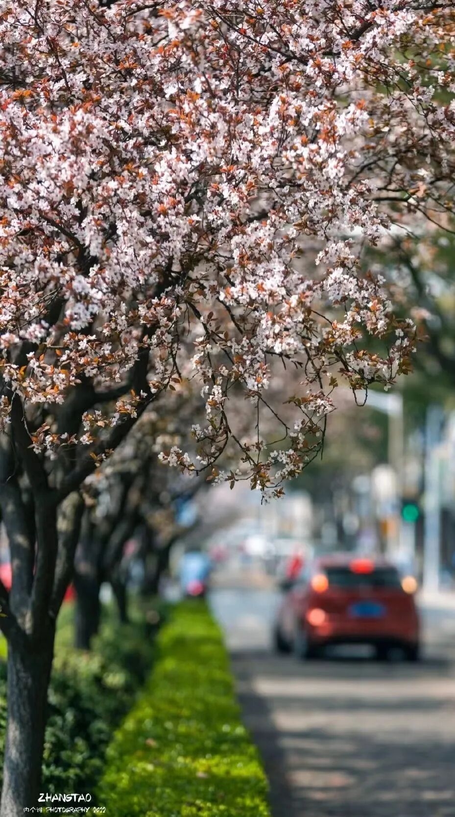 树下,伴着零星飘落的花瓣,行人来来往往。微风、暖阳、春花,所爱之人伴身侧,此刻是快乐美满的,往前是值得期待的,一如红叶李的花语——幸福、积极向上。