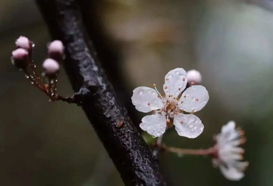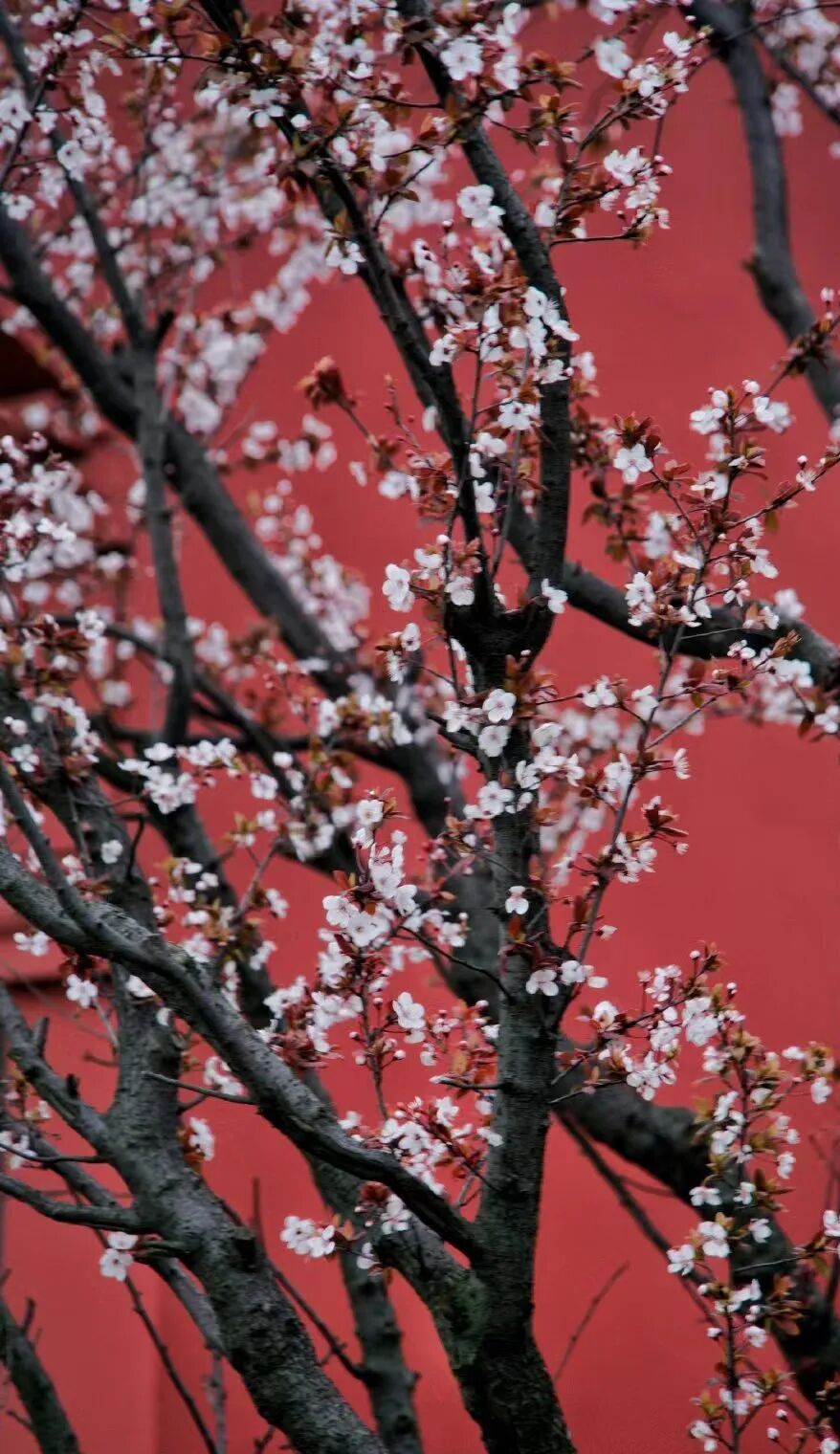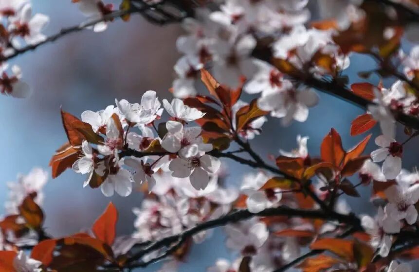 你看,暗灰色的枝干不再是孤零零的模样,不知什么时候冒出了嫩芽,铺满了小花,属于红叶李的春天已然到来。